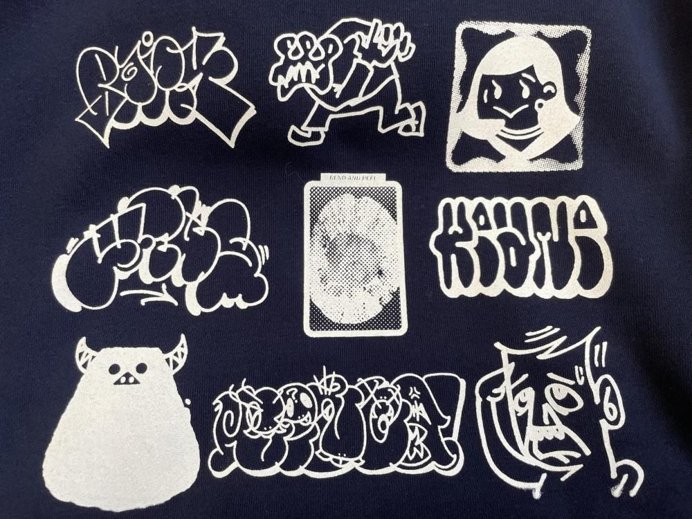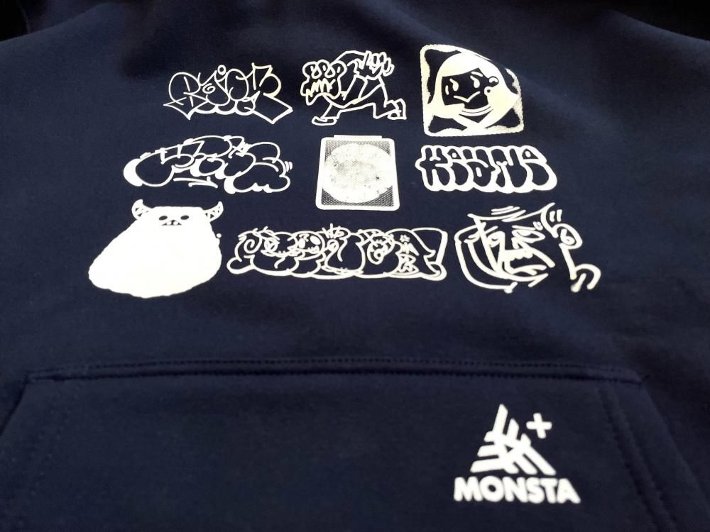 左上から時計回りにBARK, KICHI, HITOTSUME, KEANE, NOTE, RINGA, SFIKT, YIPS, DOTS FLOWの描くThrou upとMONSTA plusのロゴがフロントにプリントされております。